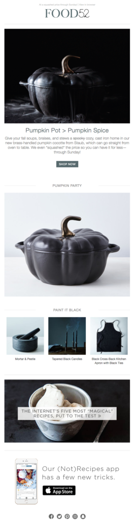 We love the spooky nature of the GIF and how the dark colors are repeated throughout the email for a monochromatic look. As the most important piece of content, it makes sense that the GIF appears at the top. In fact, when it comes to establishing hierarchy, a large image that stretches the width of the email is the strongest option—it tells readers what’s most important. After that, secondary content is often divided into multiple columns, just like Food52 does with its “Paint it Black” section. The email hierarchy allows readers to see the most valuable information first and it makes the full message quick to scan, too.
