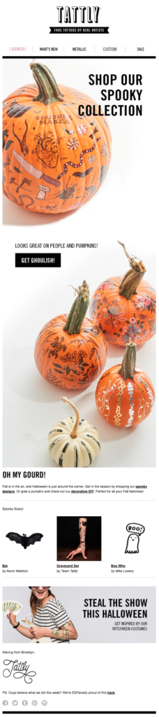 At first glance, this Halloween email from Tattly, the fake tattoo company, looks super bright, modern, and simple. Why? It’s a matter of white space.