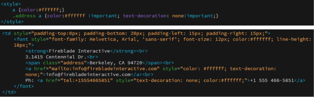 We need to act in a different way for an address or date, however. For these, it is necessary to define a class (.address) that imposes the anchor tag that will automatically insert the color within the client (color: #ffffff;). Above all, it should removing the underlining, which is a default feature of each link (text-decoration:none;).
