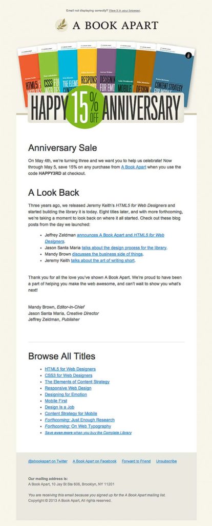 - Celebrate milestones – Most impulse purchases are made when someone is happy or excited. If you know your customers’ birthday, anniversary, first purchase date, etc., celebrate it! Send them an email highlighting the special day and offer a discount off their next purchase.