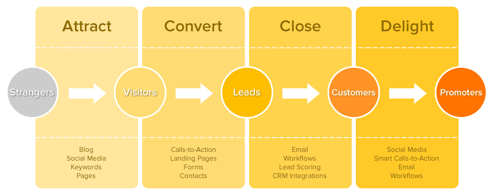 We can distinguish four fundamental steps in inbound marketing methodology. The graph below was edited by Hubspot and places the necessary techniques and tools under each phase.