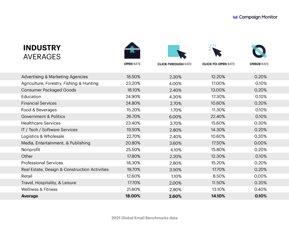 To understand if you need to start worrying about your campaigns or if you can rest easy at night, you can compare the data with the average values of those metrics in the world of Email Marketing: