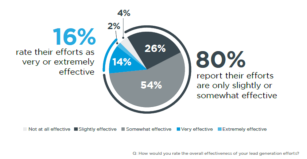 A b2b lead generation report released by Holger revealed that most marketers are not satisfied with the result they are getting. About 80% of the people surveyed said their efforts are only slightly or somewhat effective. Only 16% rate their efforts as extremely effective and 4% report their lead generation programs as not effective at all.