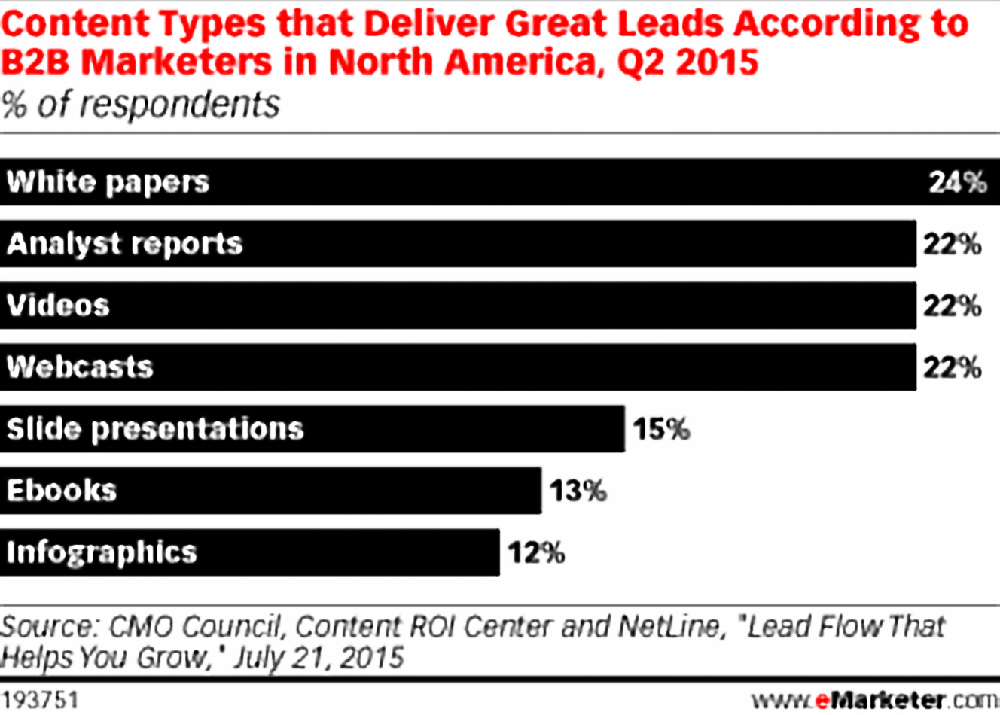 Other lead generating content marketing strategies includes white papers, analyst reports, videos, webcasts, slide presentations, e-books, and infographics.