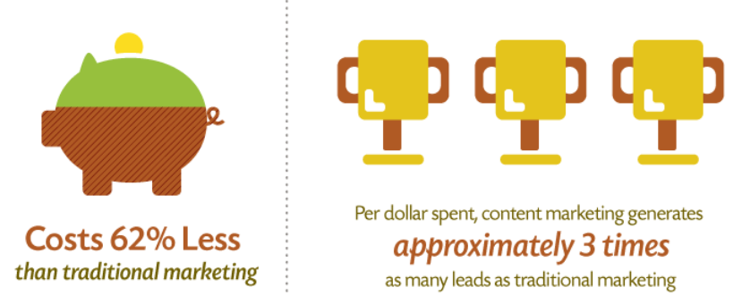 The interesting fact about content marketing is that it is very cheap. In fact, it costs 62% less than traditional marketing and per dollar spent, and it generates approximately 3 times as many leads as traditional marketing.