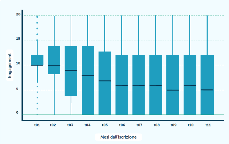 - the first months of subscription are decisive for acquiring the contact’s loyalty: a lacking or absent engagement strategy can lead to the conversion of a new user into an inactive user in just a few months with an impact on deliverability and sender reputation