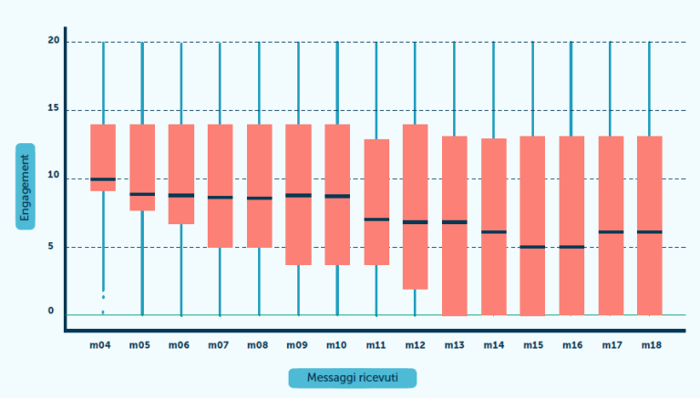 The graph clearly details that an initial increase in engagement (from the timeline’s starting point, i.e. subscription) is followed by a more substantial and evident declined interest in communications from users. In fact, we see the value of the median decrease and then level off in the following months. What does this mean? This means that the first months of subscription are decisive to build the customer loyalty of the acquired contacts. In just a few months, a lacking or completely absent engagement strategy can lead to the conversion of a new user into an inactive, and probably irrecoverable, user.