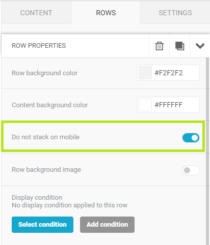 Here, MailUp gives you the possibility to choose whether to line up each content row on a mobile or not. Simply select or deselect the item in the right column, moving the mouse above the row of interest.
