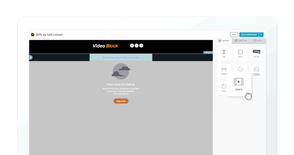 To insert a video into the creative, simply copy the URL of the uploaded video to YouTube or Vimeo and paste it into the video block. BEE then automatically takes care of retrieving the video preview by inserting it into the template using the cover image and entering the “play” button.