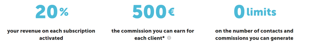 Let’s look at an example: A digital influencer recommends the use of MailUp in their newsletter. Thanks to this, one of their contacts becomes a MailUp customer and activates an annual subscription of the platform’s Premium edition. The total profit for this one client? 500 euros or 20% of the value of the original subscription.