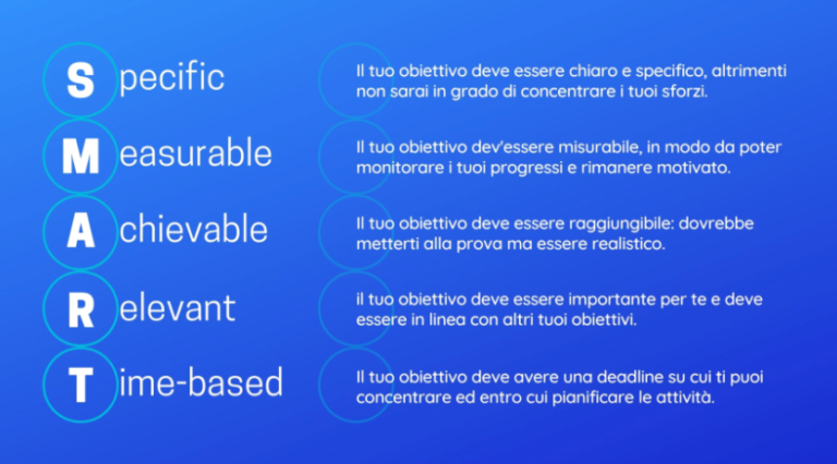 To help you in this activity, use the SMART goals technique. SMART is an acronym of the 5 fundamental qualities that should characterize any objective: