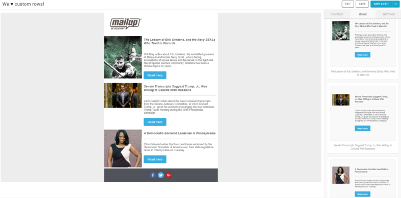 All you have to do to insert a custom row is drag and drop it inside the body of the email. Once inserted, the content’s text and images can be modified.