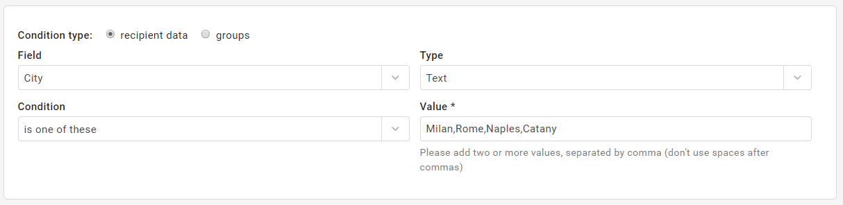 The filter will search within your database, locating only those recipients residing in the cities of Milan, Rome, Naples and Catania. As mentioned, you can also carry out the opposite operation, excluding the same cities by setting the condition “is not one of these”.