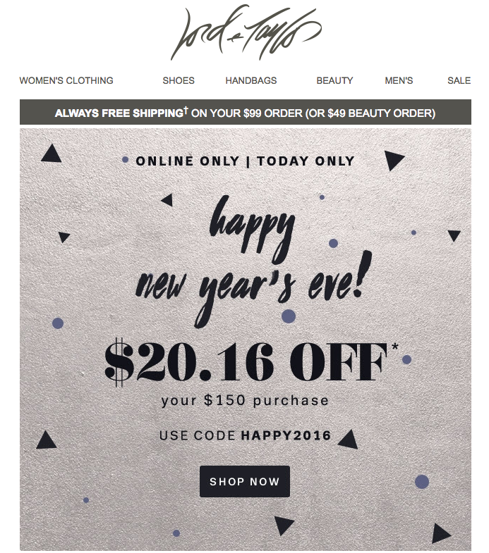 Last year, we caught a few emails in our inbox offering a 2016-themed discount for $20.16 or 20.16% off a purchase. This is a cute and clever approach that many brands aren’t using yet. Lord & Taylor, for example, was the first to send a two-email campaign that started with the subject line, “Special Email Exclusive Offer Only for You — Happy New Year!”.