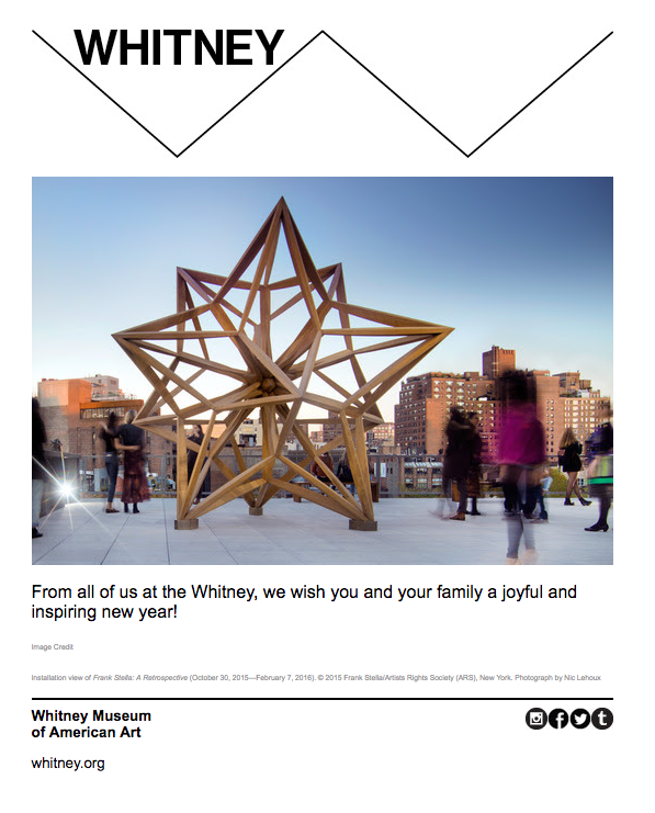 If you haven’t sent a holiday e-Card to your customers yet, New Year’s Eve is a great time to do it. Holiday e-Cards show good will, connect you with your audience, and offer a nice break from the usual emails readers receive. Plus, e-Cards can be really simple and heartfelt. Here’s a sweet example from the Whitney Museum: