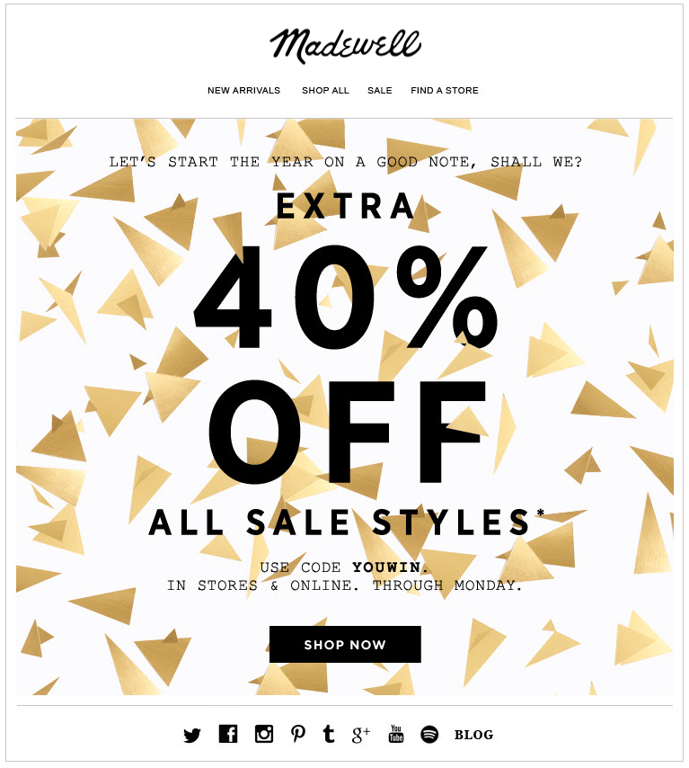 By the time January 1 rolls around, there’s a good chance your customers are going to be all shopped out. To reinvigorate readers, some brands offer big sales events. A shipping incentive or a small discount might not be enough, so go big—like Black Friday big. That’s what Madewell did, by offering a huge 40% off sale styles campaign.