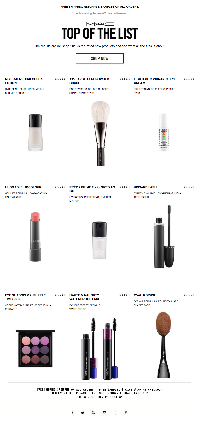 Another way to motivate shopping-fatigued readers? Curate this year’s list of bestsellers. That’s what MAC Cosmetics did in this very simple three-column email.
