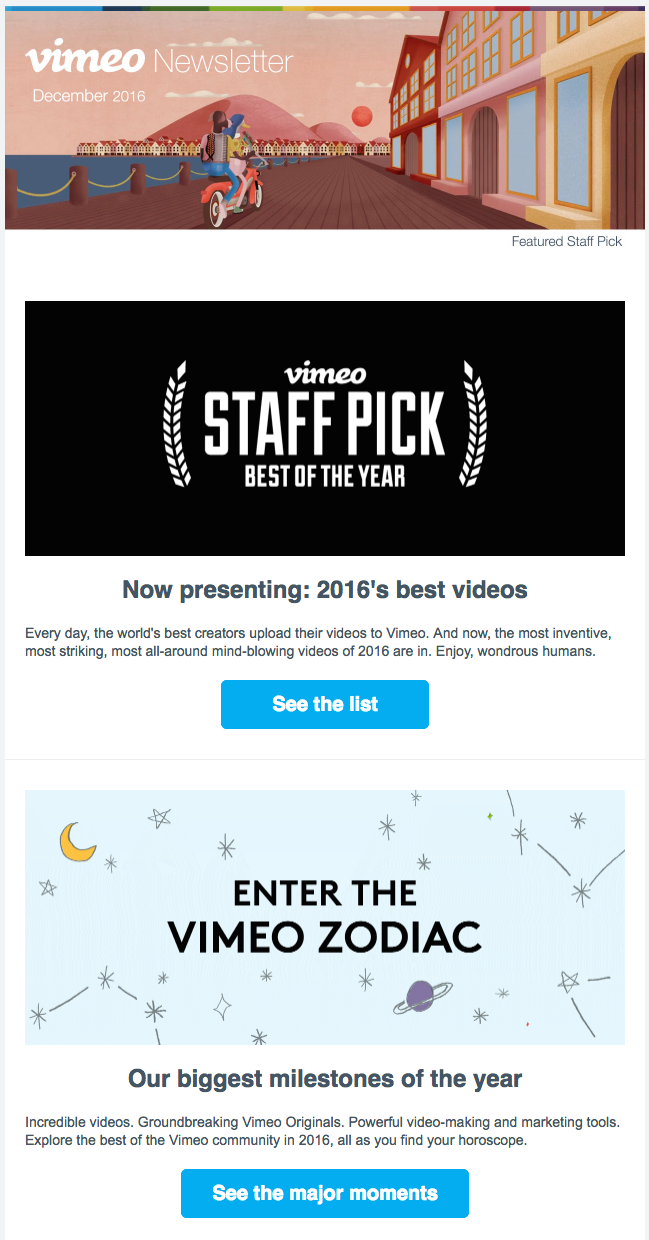 If you regularly send content in your email campaigns (i.e. newsletters), you’ve probably prepared a New Year theme. A popular way to look back at the new year is to have a round-up of the past year’s best content, which is what Vimeo does. Here are the first few modules of their recent email (subject: The year’s best videos + milestones):