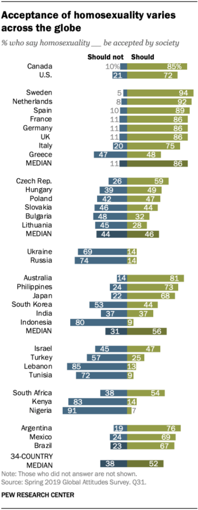 According to the latest analysis by the Pew Research Center, the degree of acceptance of non-heterosexual orientations differs greatly from nation to nation: