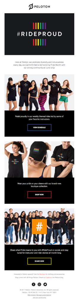 Peloton celebrated Pride Month by creating a campaign with a customized design and a hashtag. These are clean and simple, yet impressive at the same time. The heading with the hashtag and the final invitation to join the conversation on social media networks represent an excellent strategy. This expands the campaign and brings the dialogue from the email channel to further platforms, helping strengthen the community bond.