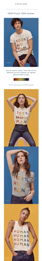 This Everlane campaign has it all: images that highlight the product while, at the same time, suggesting the idea of inclusiveness: a slogan which is simple yet effective (“100% Proud. 100% Human”); a neat design, and a full-on Pride-themed, rainbow-colored CTA.