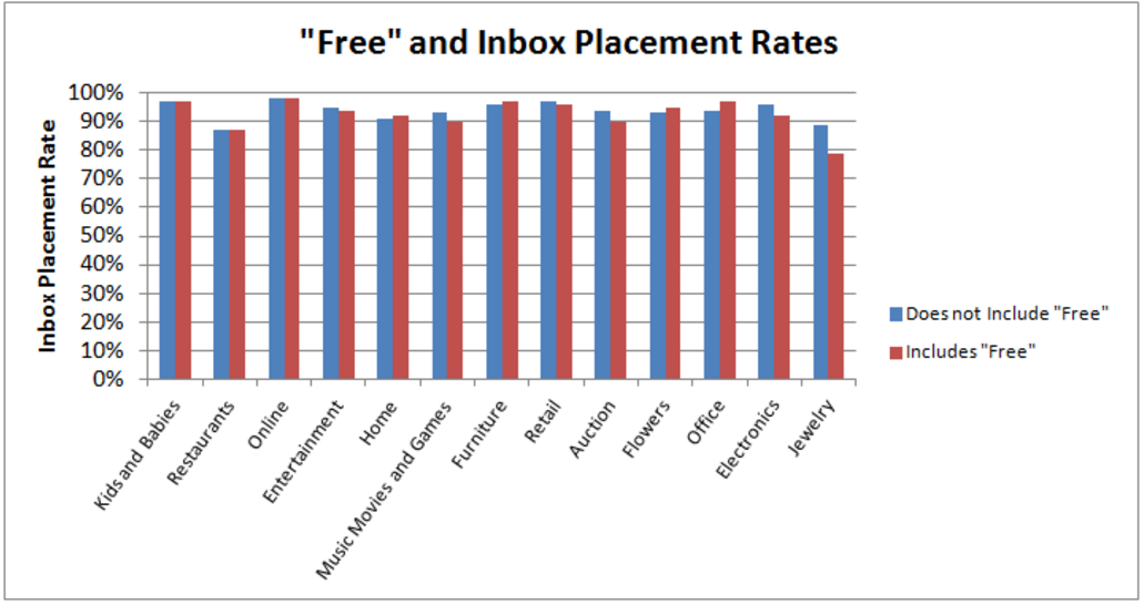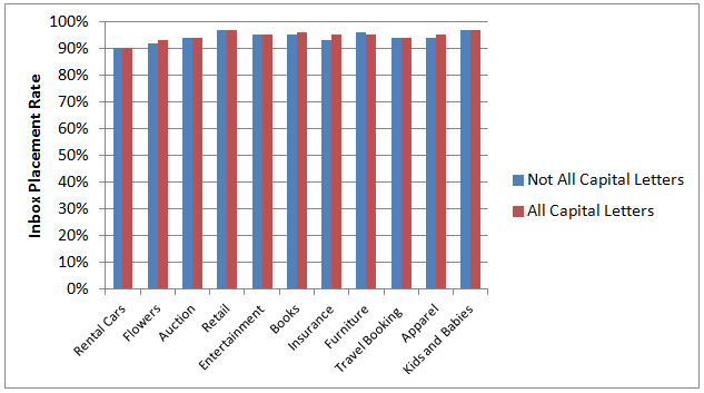 The evidence does not end there. Some interesting studies show that in several sectors, subject lines containing high-risk spam items (such as the term free or whole words in upper case) present delivery rates substantially identical to emails with “clean” subjects. Proof that the rules apply until they are broken.