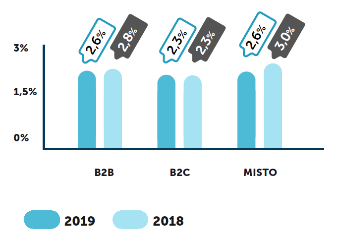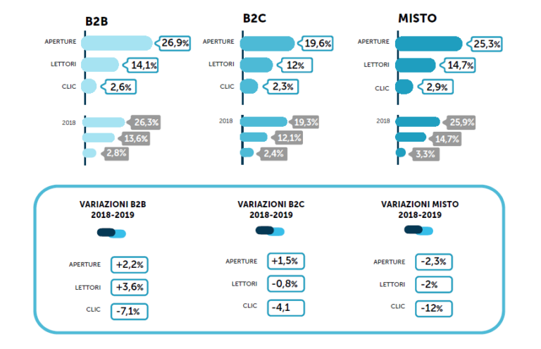 In analyzing the broken-down results by audience type, the mixed sector is almost stationary (from 23.9% to 23.8%: -0.4%) while both B2B (from 27.1% to 27.6%: +1.8%) and B2C (from 18.8% to 19.2%: +2.1%) experience growth.