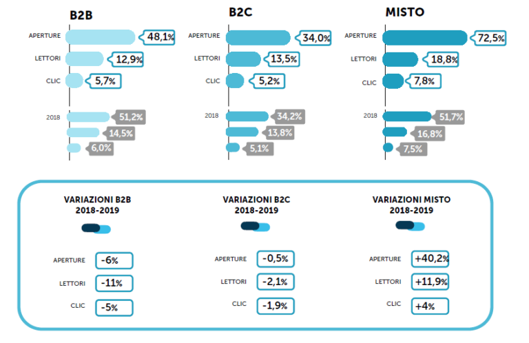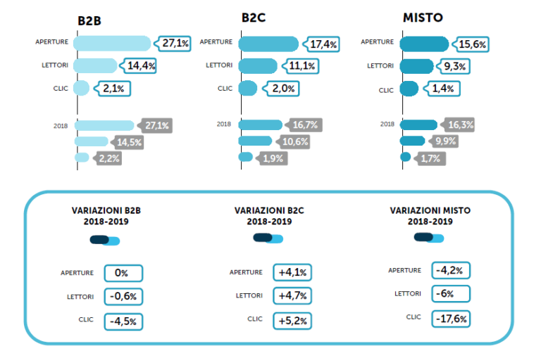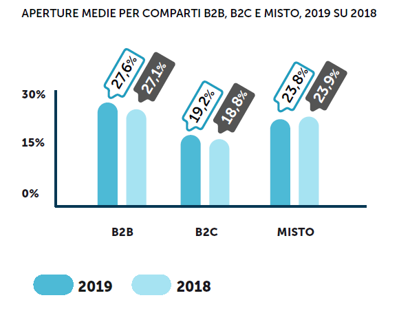 The ground on which companies must focus is, once again, the click (a metric that should improve especially in B2C, whose click rate is 2%). The goal is to capitalize on openings by converting them into email content interactions.