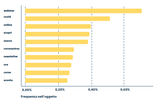 In the last focus we took into consideration all the keywords used in all the emails sent last year and their degree of frequency, highlighting a clear prevalence of themes clearly linked to the health emergency. In particular, the keyword “webinar” was the real protagonist of the email objects, present in 0,72% of emails sent, followed by “covid” with 0,51%. What is surprising is the frequency of these themes in sectors that, before the pandemic, were rarely associated with these types of online initiatives and events, such as Tourism and Hotels, in which the keyword reaches eighth place among the ten most used, and Health / Fitness and Sport, in which it reaches third place, with a frequency rate of 0.50%.