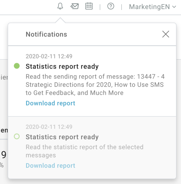 As you know, MailUp’s statistical reports are exportable in a CSV file with all the data and the main metrics. To optimize this activity, we’ve created a new notification center (the bell, top right) to notify you when the requested report is ready to download.