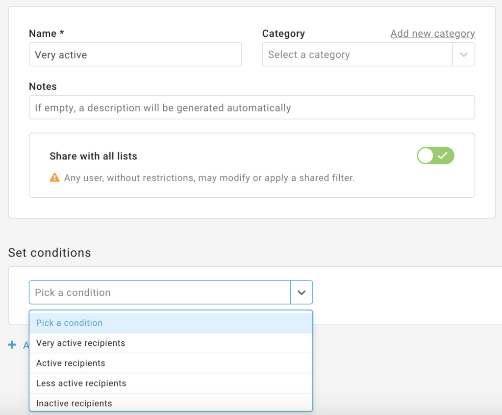 We’re now introducing an integration and complement function. Starting today, those who’ve activated Engagement will find a new set of filters on the platform in the Recipients > Filters section. This enables you to utilize the information collected in the Engagement reports and create recipient segments based on a set of conditions: