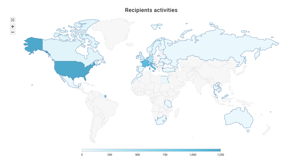 - Mailing geography, helps understand where users’ activities are distributed geographically, globally, or nationally. A heat map gives an account for the number of openings and total clicks of each country and region (the latter is available for Italy, Spain, France, and Denmark).