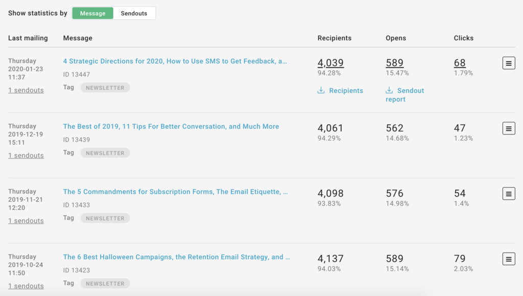 - Sendouts, to consult a separate report for each mailing of the same message. This is very useful for those who adopt, for example, automation tools (triggering periodic sendings of the same e-mail) and for those who send the same message several times.