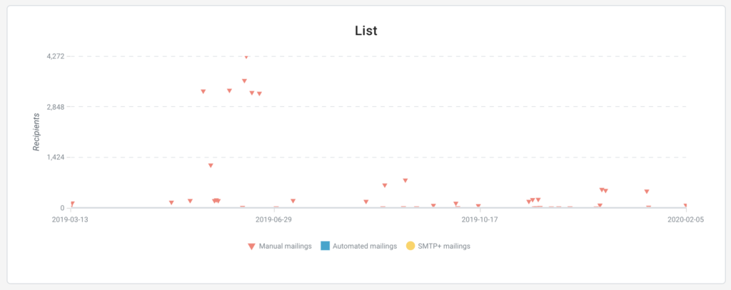 - List, so that you can take a look at the proportions between the various manual, automatic, and SMTP mailing flows.