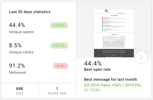 You will find the open, unique click, and delivery rates (alongside the variations compared to the previous 30 days). Then, in addition to a summary of the recipients reached and the number of emails sent, you will find a small report that identifies the messages that stand out for their open rates and clicks, with the relative numbers.