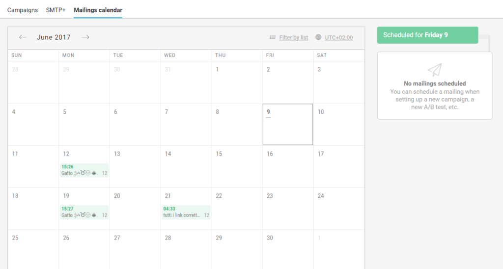 - Check, through the calendar view of the dashboard, that everything is under control and that you have not forgotten a mailing