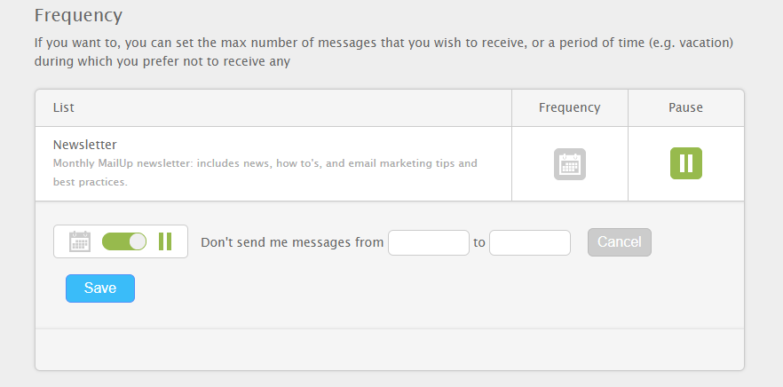 On the other hand, each contact that receives a message sent via the MailUp platform has the possibility to access its Profile Management Center and independently set the mailing frequency and receiving breaks, check (and possibly update) their data, and register or unsubscribe from specific lists. This tool is of fundamental importance due to the introduction of the GDPR, because it allows total transparency and control by the recipient about the use of their data.