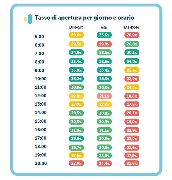 On the other hand, the recipients’ activity shows that the highest opening percentages are concentrated on days between Monday and Thursday around 9 a.m. (35% openings) and 10 a.m. Statistically, therefore, these hours of the day when the recipients are most receptive to e-mails are the most favorable time intervals for the companies.