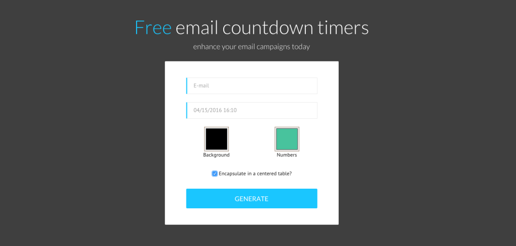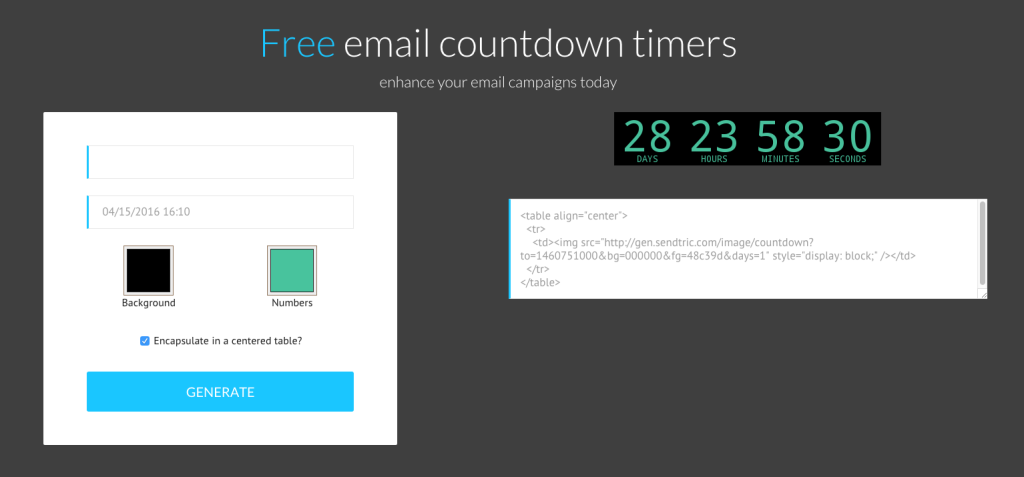 • A tool that can create and generate the HTML for a countdown timer. Be sure to use a tool that creates the countdown as an animated GIF so that you’re sure that it will render in email. We chose a simple tool calledSendtric. There are a number of online tools you can choose as well (just scroll down to our last section of this post).