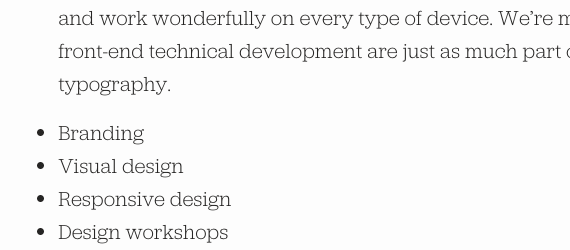Sure, we can control these variables. Yet the biggest design issue comes with certain environments. Both Microsoft Word and our browsers have made us unaware of the typographical sins that surround us. The worst? It’s the failure to properly align bulleted lists.