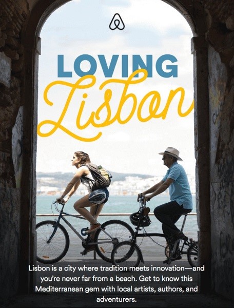 Note the destination. A broad, cursive, and fluid font unfolds flexibly. This refers to the idea of luxury, fantasy, and romance: all terms that Airbnb combines and associates with Lisbon.
