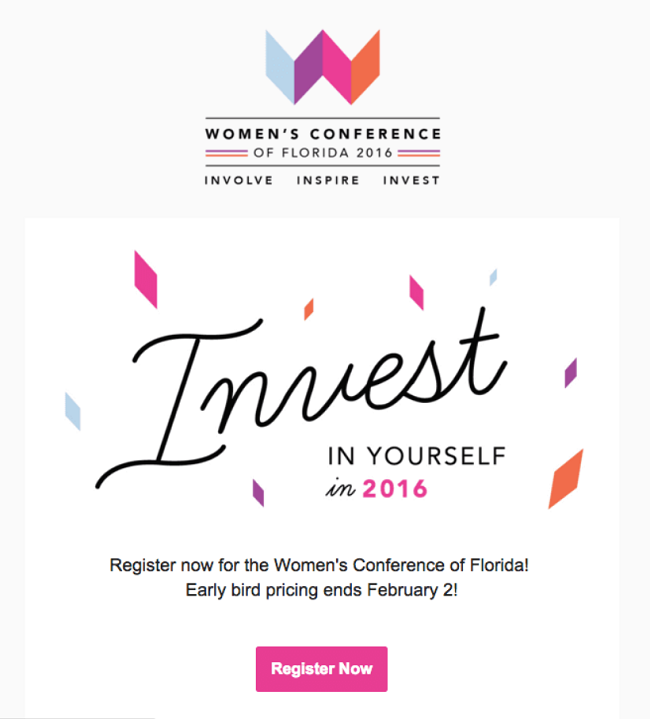 The idea of investment usually evokes a certain imagery of business, risk, cost, and expense. Now, this Women’s Conference email picks a font that makes the word and the concept elegant and creative since it’s associated with a just cause.