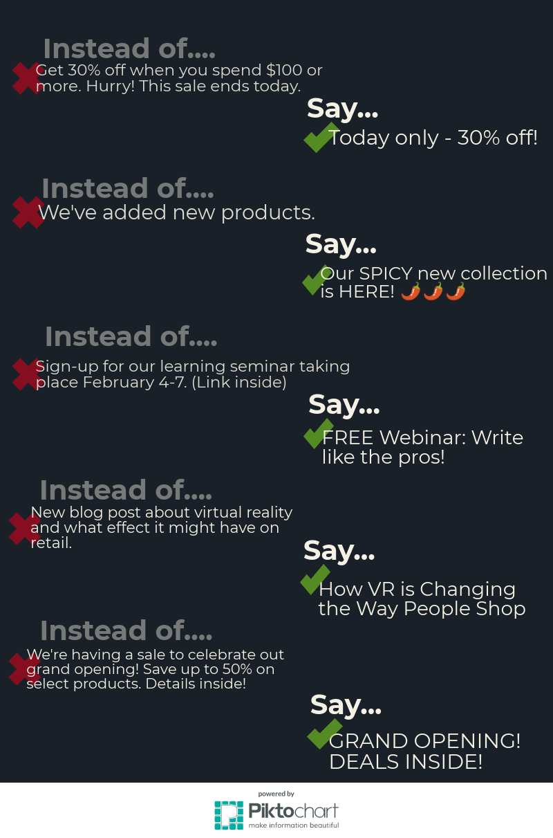 Another great option for your image is to include an infographic in your email. However, be careful not to include too many details in the infographic itself if it throws off your text to image ratio. Not only does this help avoid the spam filter, but it’s also going to help your customers search their inbox for the email if the need to go back to it, since their email host will be able to read the text, but not the infographic.